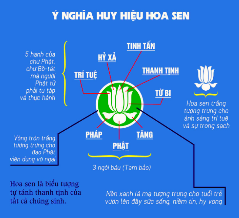 A. Năm cánh trên của hoa sen tượng trưng cho 5 hạnh của người Phật Tử. Từ ngoài nhìn vào: