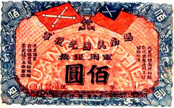 Do không có tài liệu nào xác quyết nên tờ giấy bạc Quân Dụng Phiếu (Quân dụng ngân phiếu) do Quang Phục Quân phát hành, cho đến nay là vật chứng duy nhất cho ta thông tin về lá “quốc kỳ đầu tiên” đang đề cập. Cũng trong “Tự Phán”, cụ Phan Bội Châu kể lại: